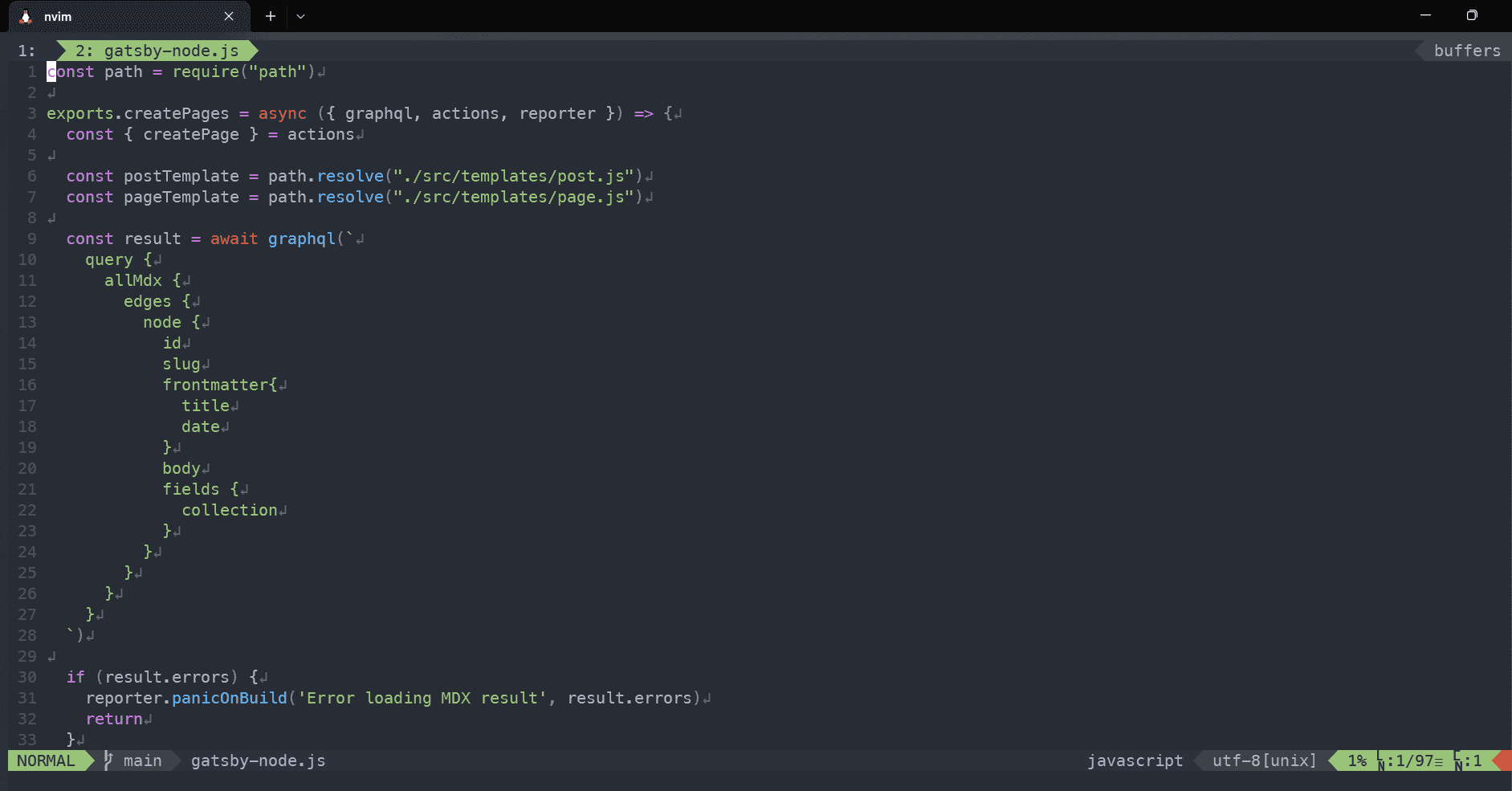 Getting into the actual coding part, we have Neovim. I used to use vim, but I heard Neovim was getting popular and decided to try it out. I've been using it for over a year while making changes to my configuration). I haven't dug deep into the documentation, written Lua for scripting, nor used it differently from how I used vim, so I'm probably not using it to its full power.